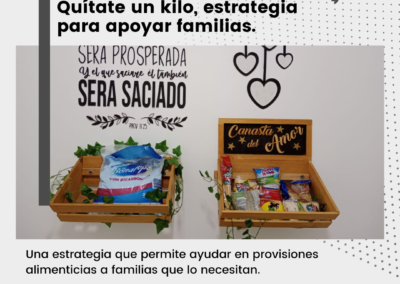 Esta estrategia que anteriormente se llamaba “Yo-Yo; Yo merco, Yo Dono”, busca a través de un aporte voluntario fortalecer la provisiones de alimentos; consiste específicamente en que las familias nazarenas que se encuentran en condiciones económicas favorables puedan poner “un kilo” de más en sus mercados; por ejemplo, si habitualmente para el hogar, compran 2 kilos de azúcar; añadir un kilo más y donarlo a la iglesia, y así con diferentes productos como arroz, maíz, frijol, entre otros alimentos.